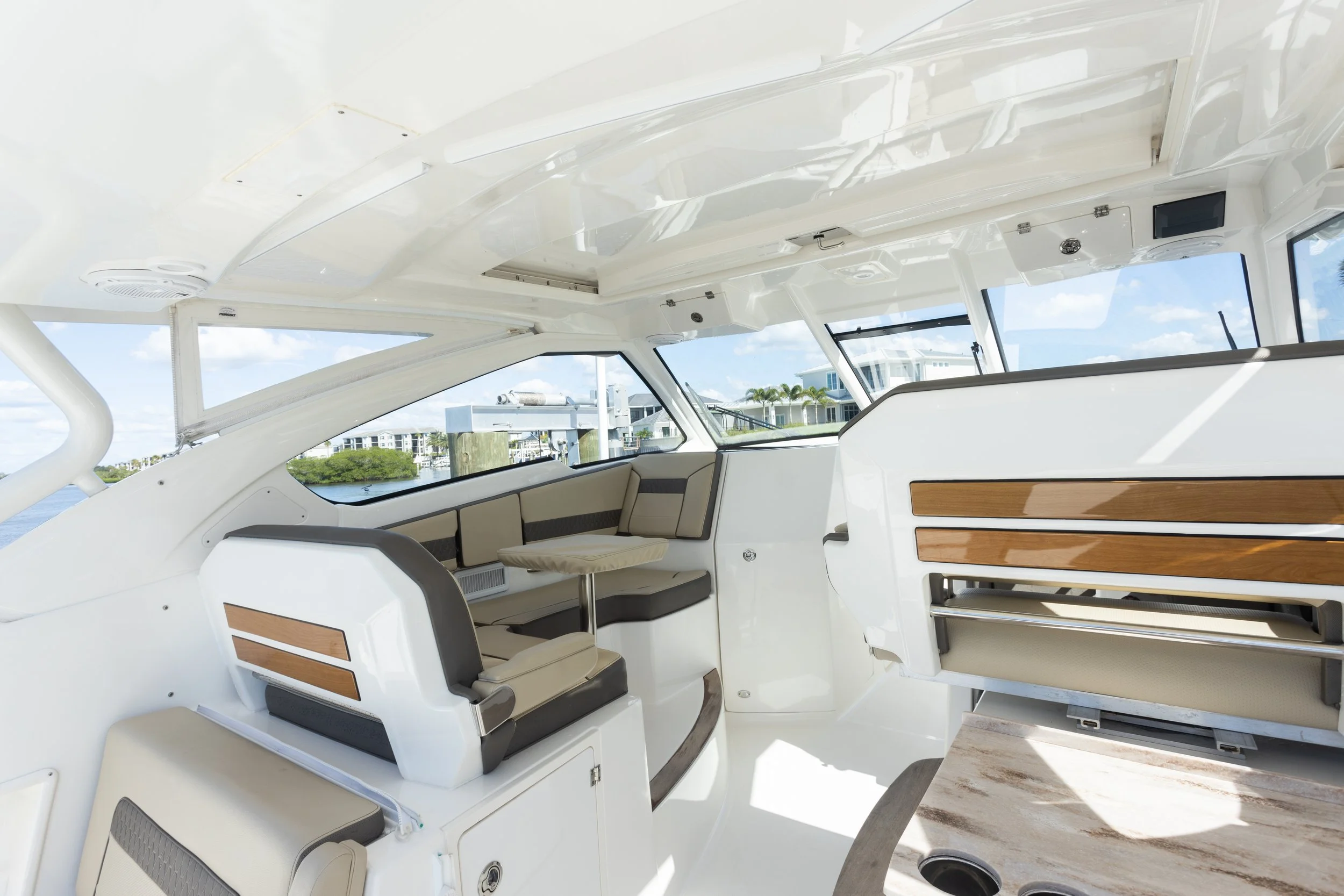 Interior of a boat cabin with white and beige seating, steering wheel, and control panel.