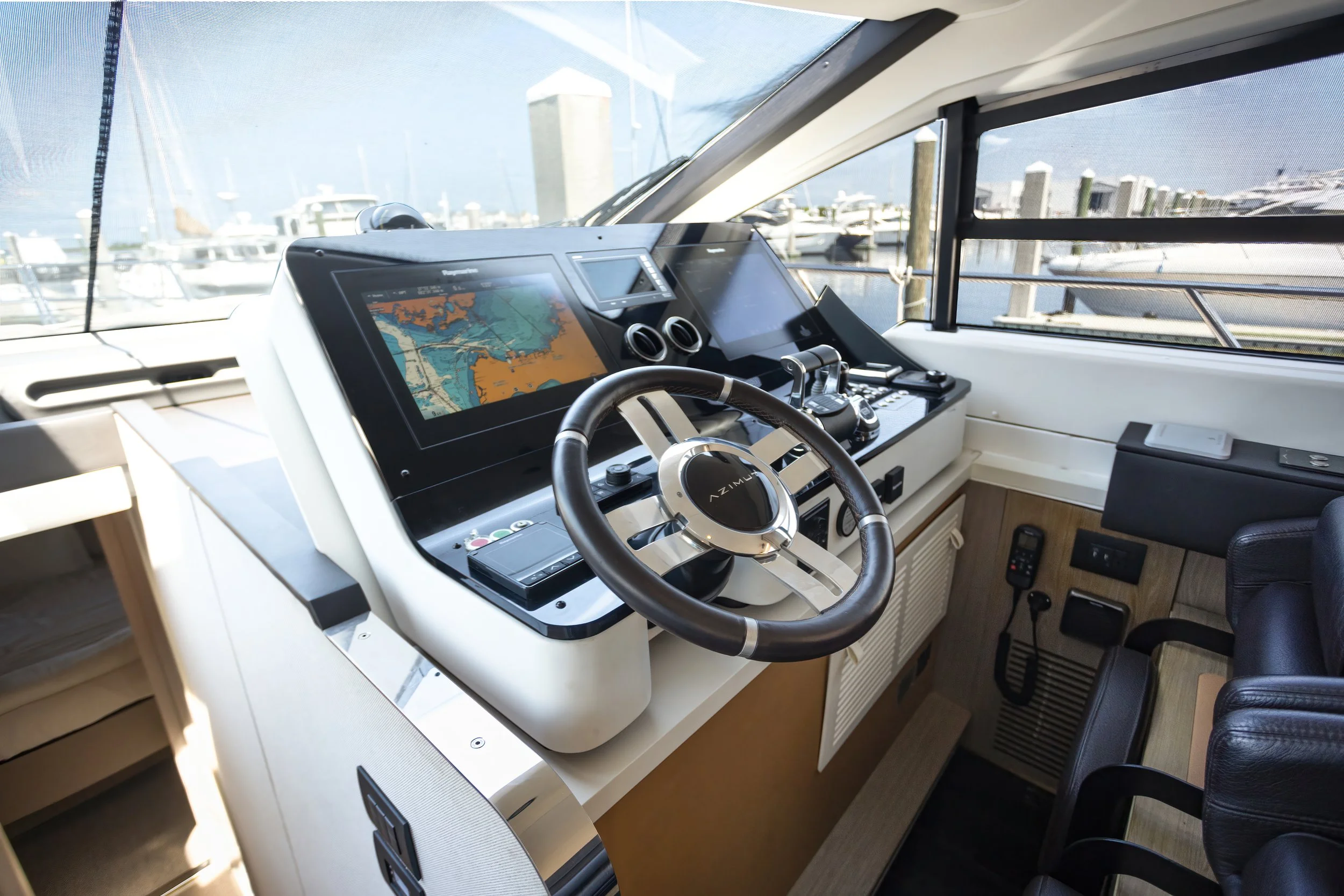 Boat cockpit with steering wheel, dual GPS screens, control panel, and throttle lever.