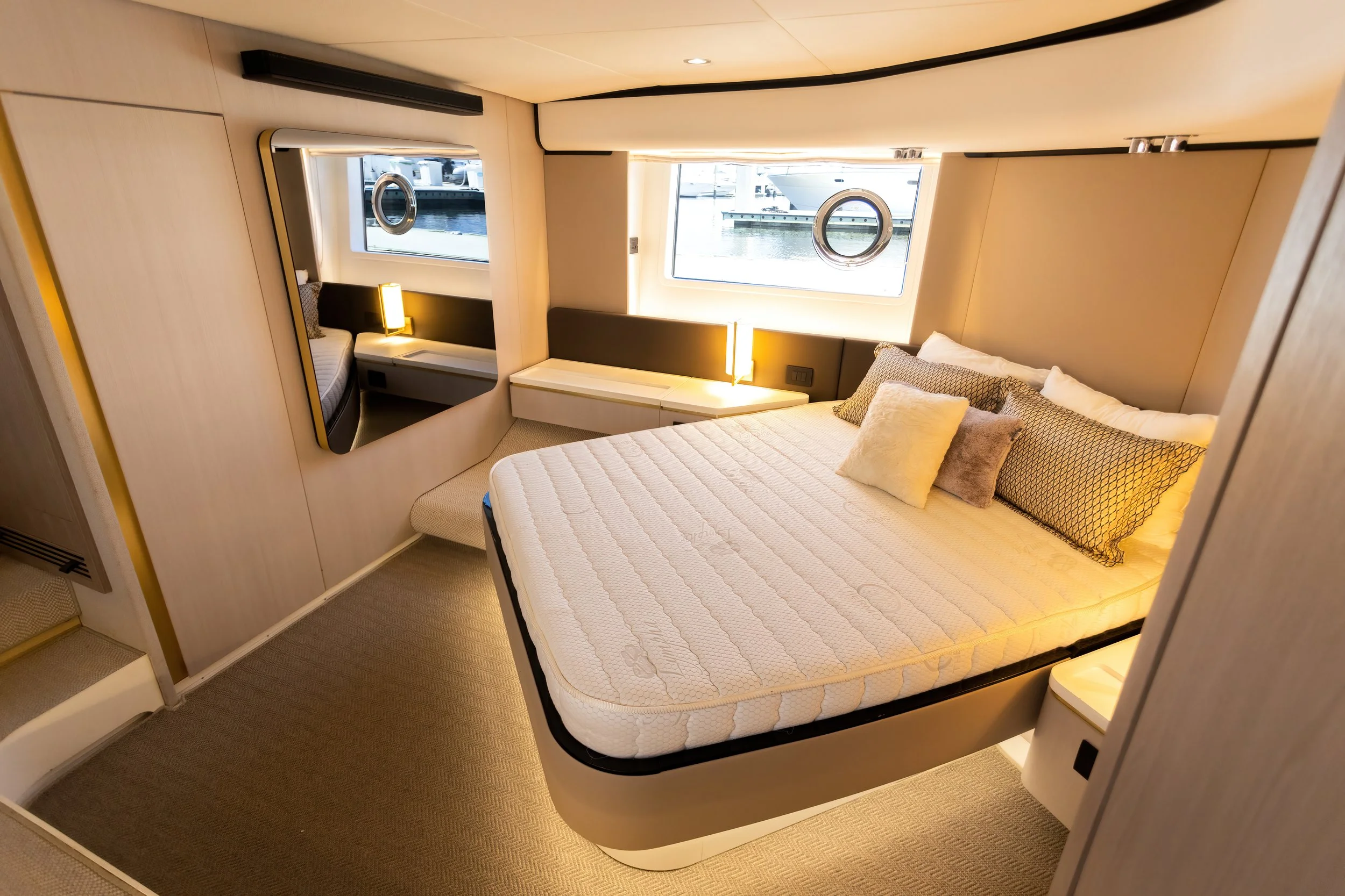 Modern yacht bedroom with bed, pillows, mirror, and windows showing marina view.