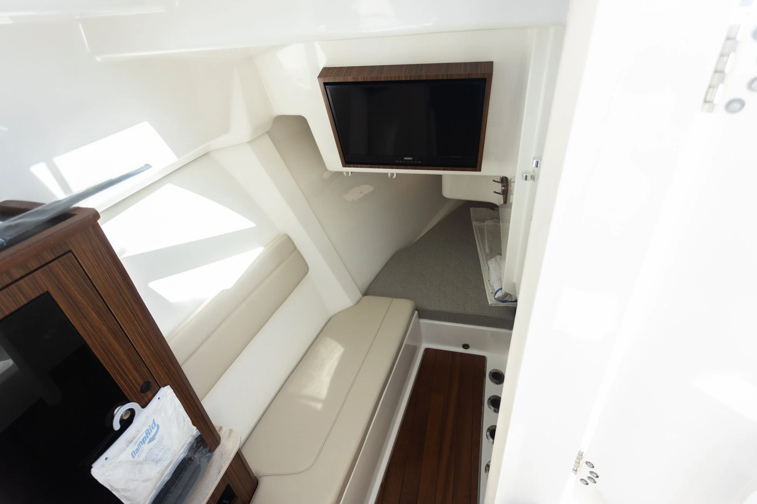 Interior of a boat cabin with a beige seating area, wooden flooring, and a mounted flat-screen TV.